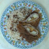 Füstölt sajttal, almával töltött szelet rántva Mazsolás rizs