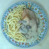 Pácolt csirkemell roston, tejszínes gombamártással, makaróni