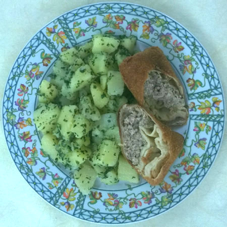 Velővel töltött palacsinta rántva, petrezselymes burgonyával
